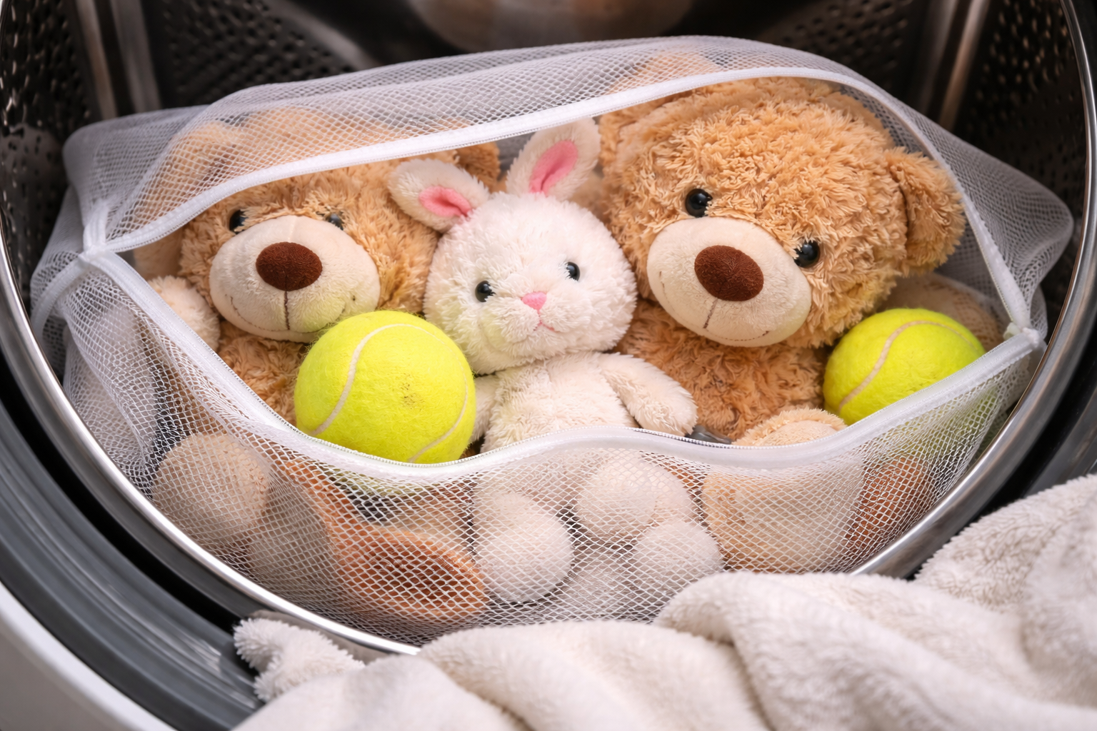Hemmelig nuance: Før du sender dine bløde dyr i vaskemaskinen, skal du lægge dem i en tæt netpose og tilføje et par tennisbolde til tromlen – det forhindrer syntepon i at klumpe sig sammen og holder formen.