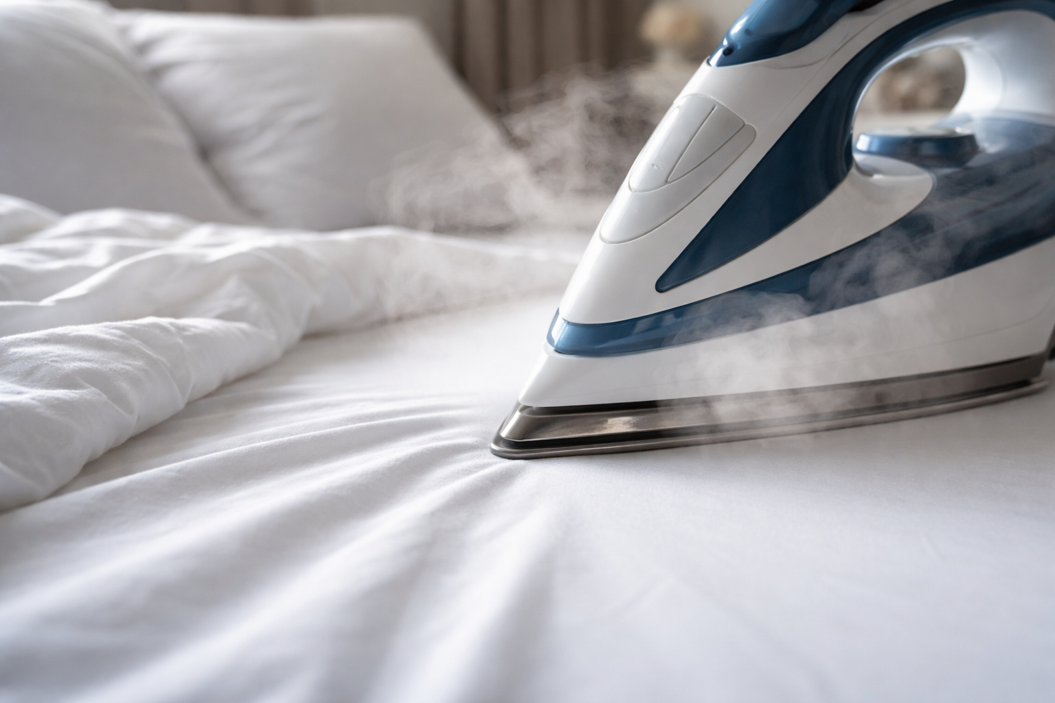 Hemmelighed: Strygning af sengelinned fra undersiden med damp forsegler bogstaveligt talt mikrorevner i bomuldsfibrene, hvilket forlænger stoffets levetid og forhindrer fnug.