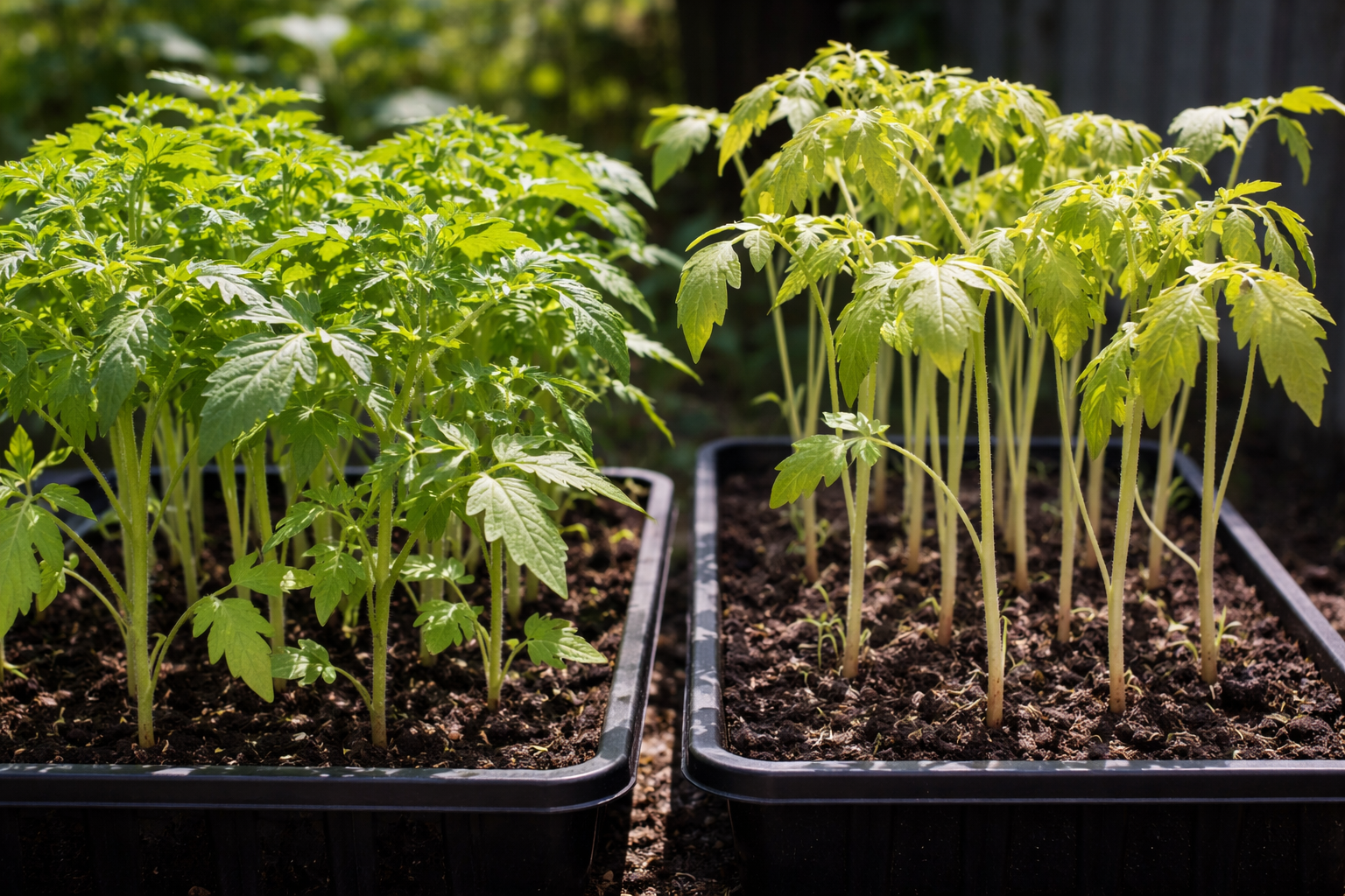 Tomater er kritisk afhængige af rigeligt sollys fra de første levedage. Når kimplanter står i skyggen eller i en vindueskarm med dårligt lys, udløses processen øjeblikkeligt. etiolation. Stænglen forlænges hurtigt i søgen efter en energikilde, bliver tyndere og mister sin elasticitet. Vævet i den unge plante bliver sprødt, og rodsystem holder helt op med at udvikle sig og bruger alle ressourcer på at trække toppen ud.