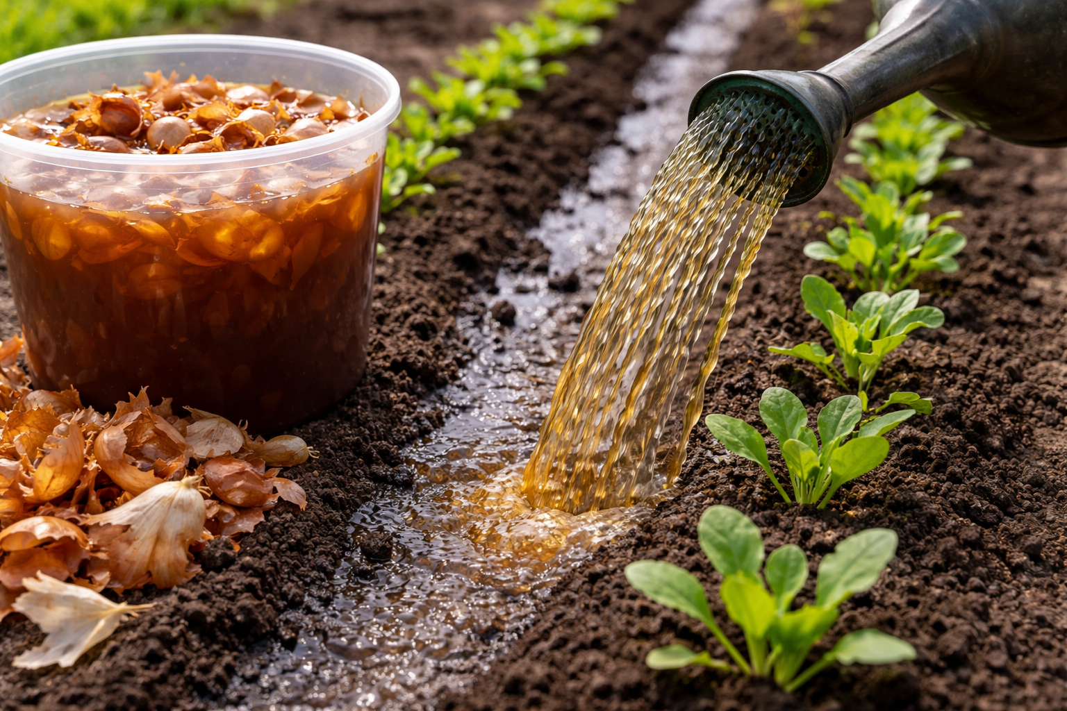 De tørrede skæl fra almindelige løg indeholder en stærk cocktail af gavnlige elementer. Hovedviolinen her spilles af phytoncider – naturlige antibiotika, der hæmmer væksten af sygdomsfremkaldende mikroflora. Jorden har brug for en blid opvågning efter vinteren, og økologisk vanding er den bedste måde at gøre det på.