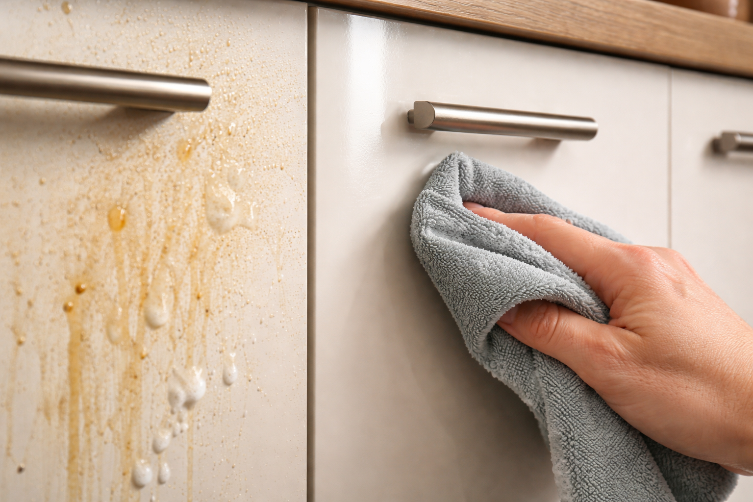 Hemmelighed: Sprøjt aldrig flydende rengøringsmiddel direkte på skabslågen. Sprøjt kun skummet på selve mikrofiberen, så der ikke kommer fugt ind i samlinger og kanter, hvilket kan forårsage irreversible hævelser i materialet.