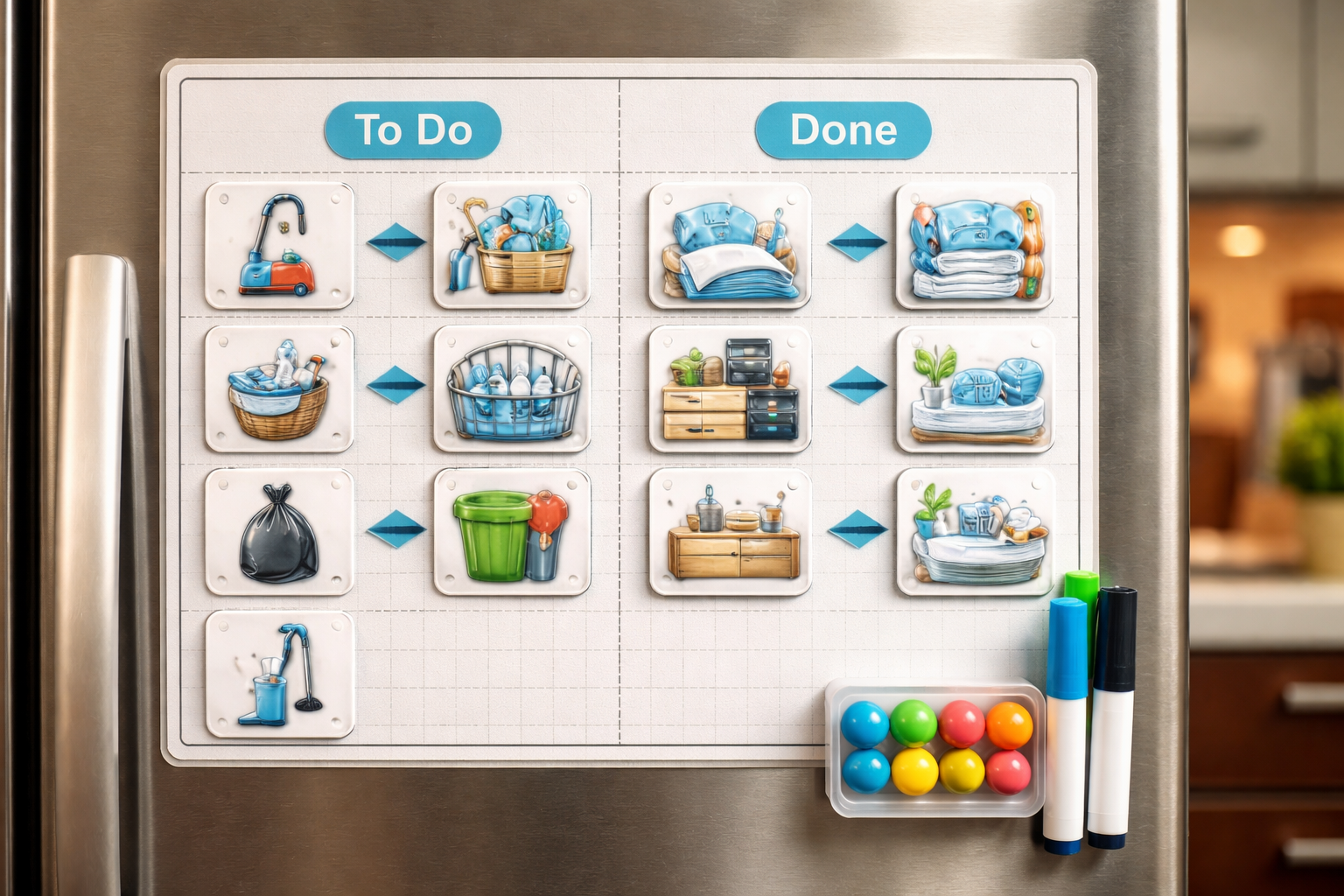 Hemmelig nuance: Lav en visuel tavle med magneter, hvor hvert familiemedlem selvstændigt kan markere afsluttede opgaver og lykkeligt flytte dem fra kolonnen “at gøre” til kolonnen “gjort”.