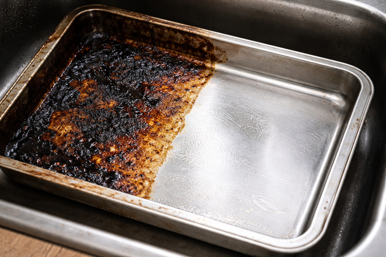 Indtørret fedt og sorte skorper på en bageplade skræmmer mange mennesker, men at skrubbe dem af med en metalflonel er en fejltagelse, der dræber non-stick-laget. Der findes et enkelt kemisk trick med basale husråd, som vil nedbryde den mest genstridige sod bogstaveligt talt for øjnene af dig.