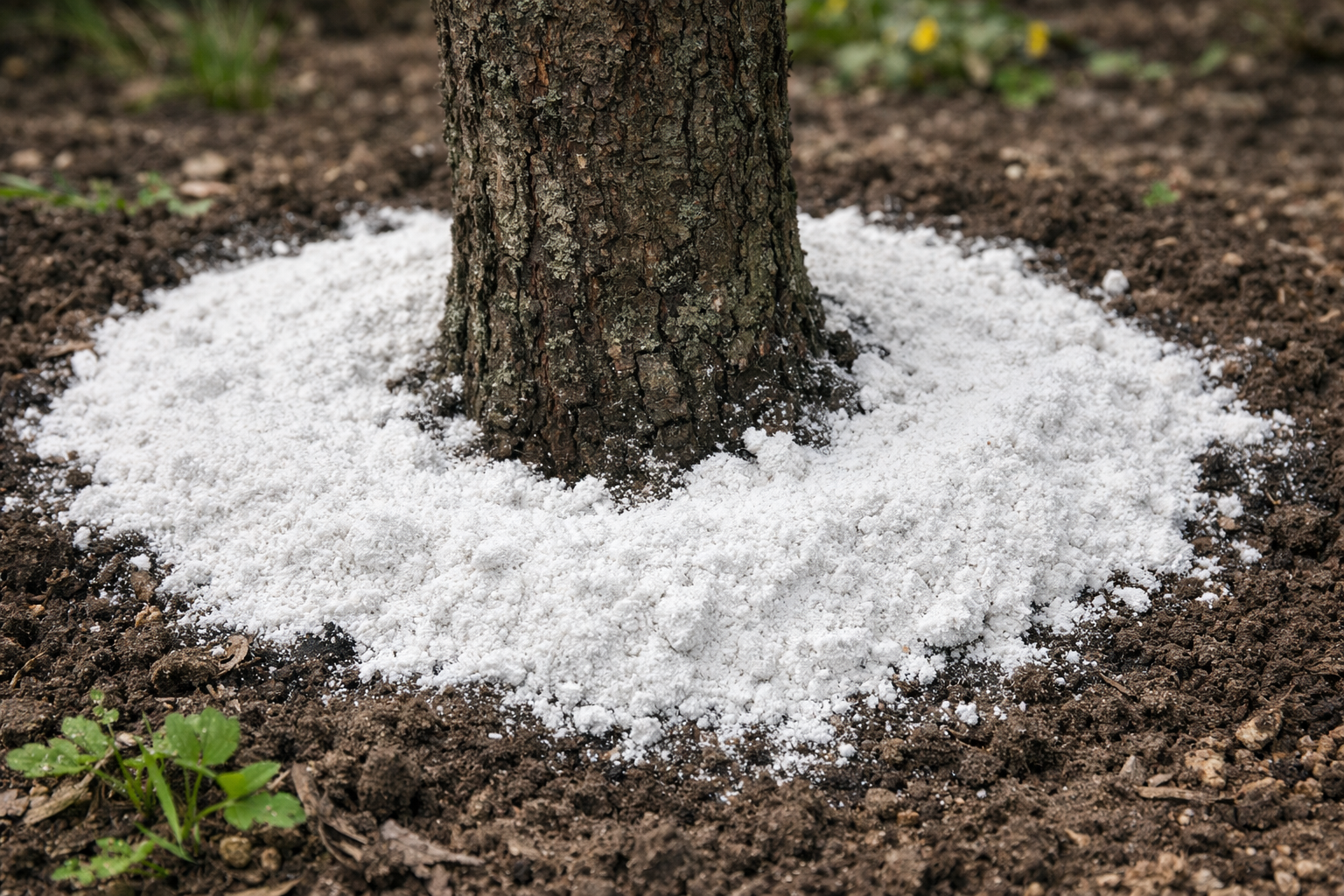 Pulveret skal fordeles langs omkredsen af kronens fremspring, hvor de aktive, nærende rødder befinder sig, altid væk fra stammen.