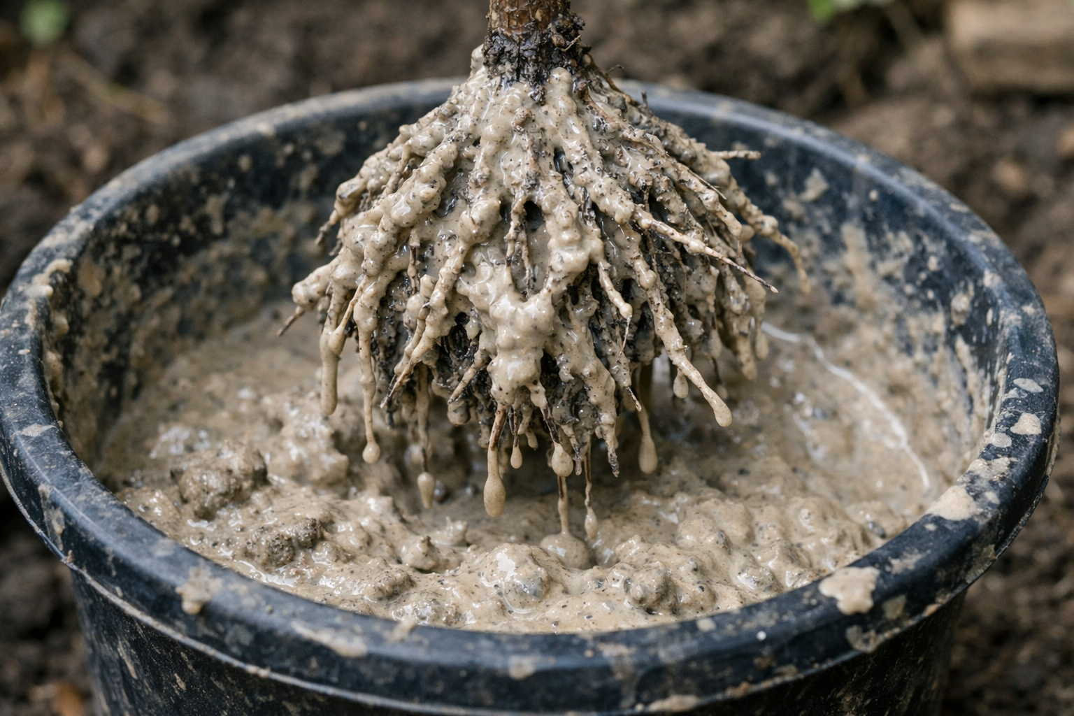 Sørg for, at lerlaget ikke tørrer ud direkte på rødderne, før du sænker dem ned i jorden.