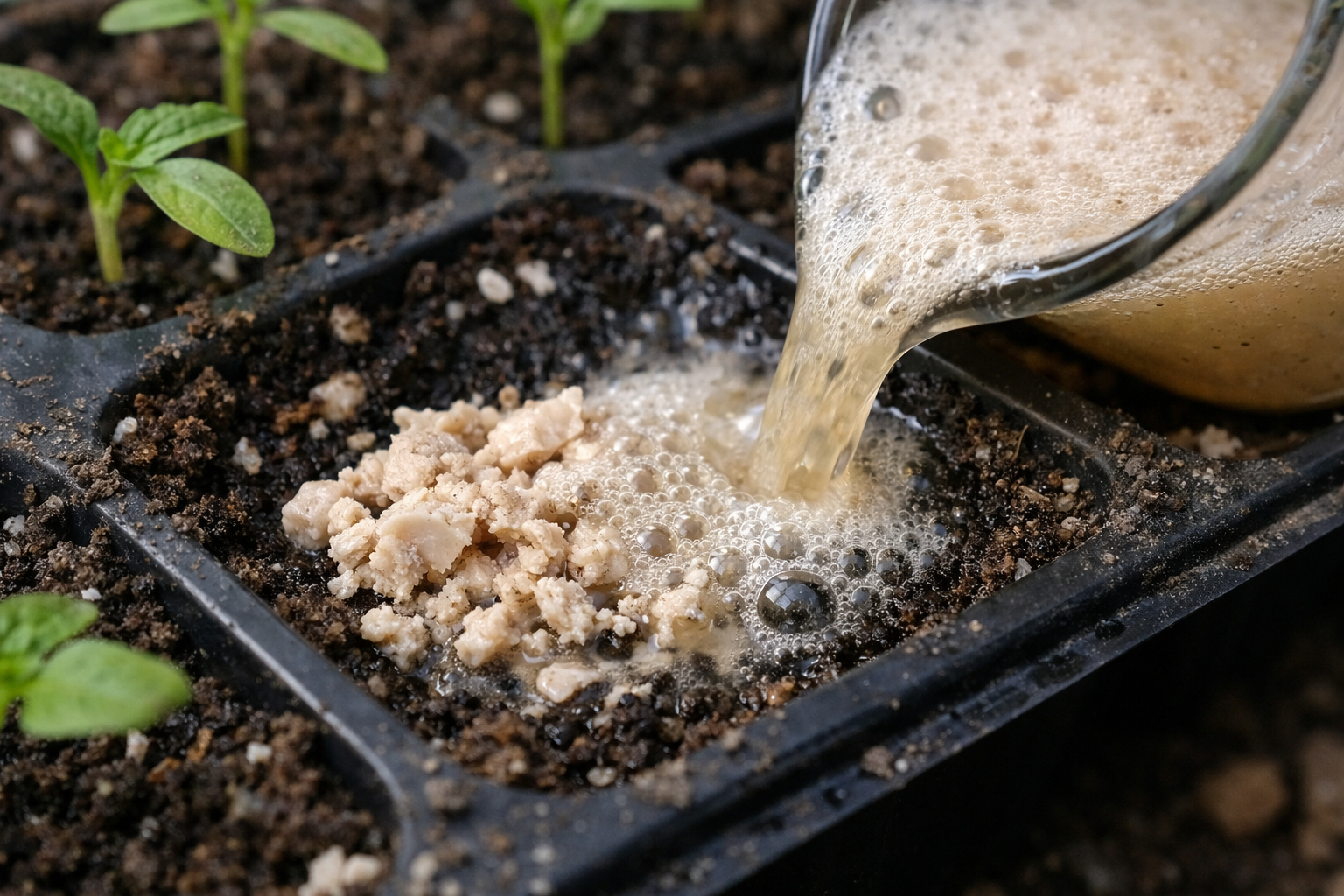 Vand aldrig planter med ufortyndet infusion, da en for aktiv fermentering ellers vil forstyrre balancen mellem mikroelementerne og ødelægge planternes sarte rødder.