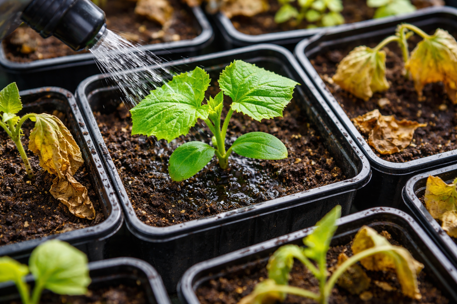 Korrekt vanding er en kunst, der kræver en streng balance. Temperaturstress dræber kimplanter lige så hurtigt som tørke. Vand skal altid holdes varmt.