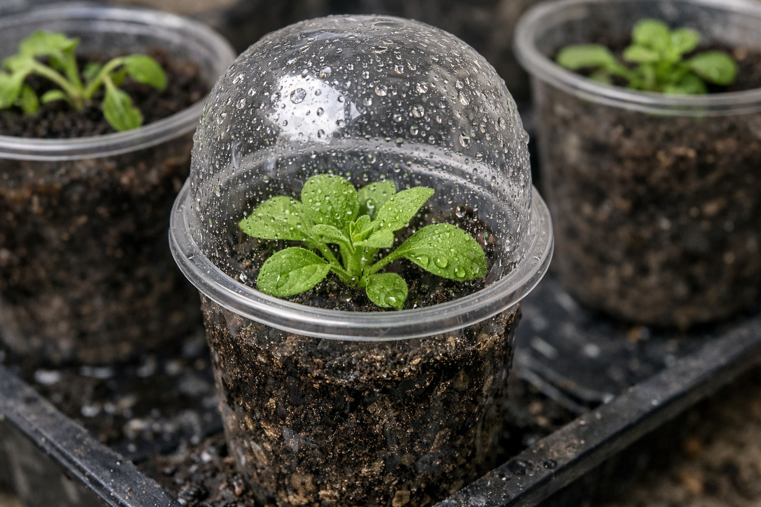 Dæk hver frøplante med en gennemsigtig plastikhætte eller film