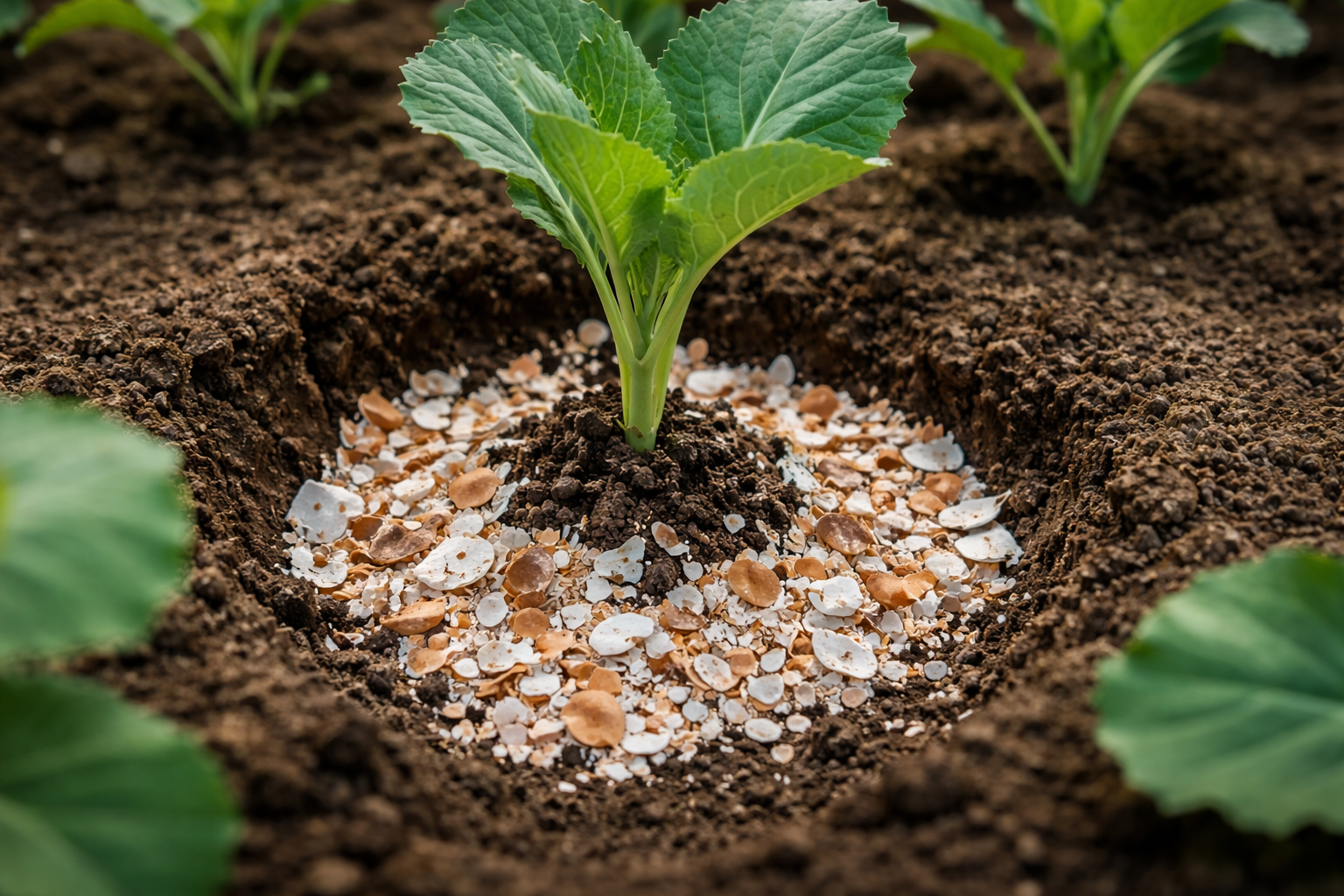 Den optimale mængde er en lille håndfuld grundigt formalet pulver pr. plante.