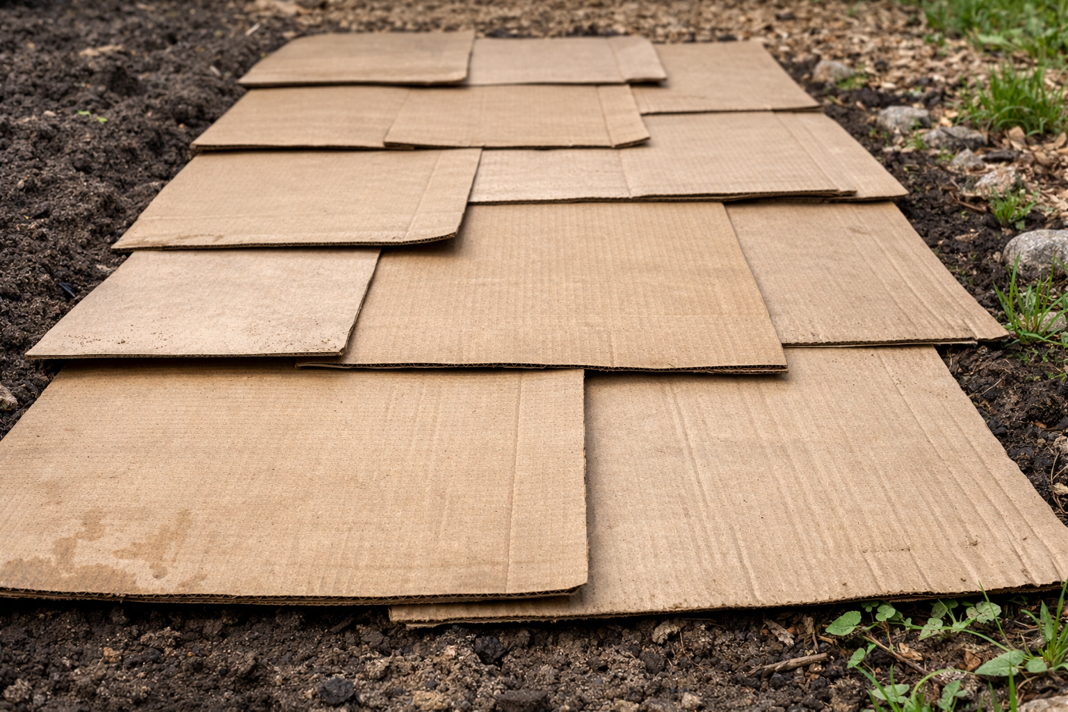 En af de mest effektive metoder anser jeg for at være brugen af almindeligt emballagepap. Det er et miljøvenligt materiale, som i løbet af en sæson nedbrydes og bliver til gødning, samtidig med at det undertrykker selv så aggressive planter som hvedegræs eller mælkebøtte.