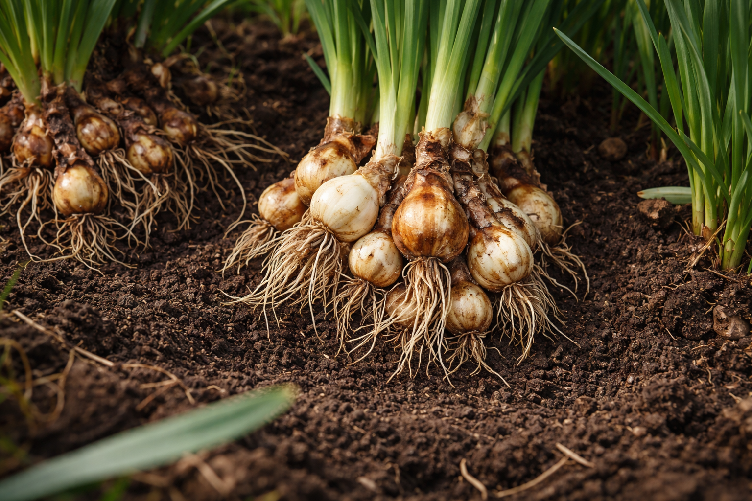 Løg, der stikker op til jordoverfladen