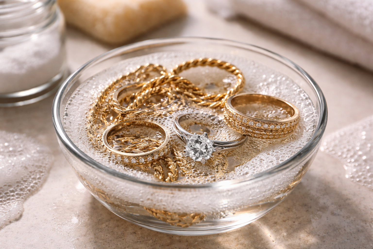 Hovedhemmeligheden bag perfekt rengøring ligger i vandets temperatur, det skal være moderat varmt for effektivt at opløse hudfedtet, men ikke beskadige den smykkelim, der fastgør stenene.