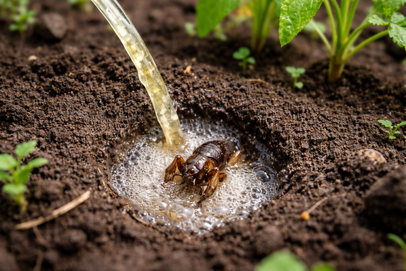 Hæld væsken direkte i banen, indtil skadedyrene dukker op på overfladen.