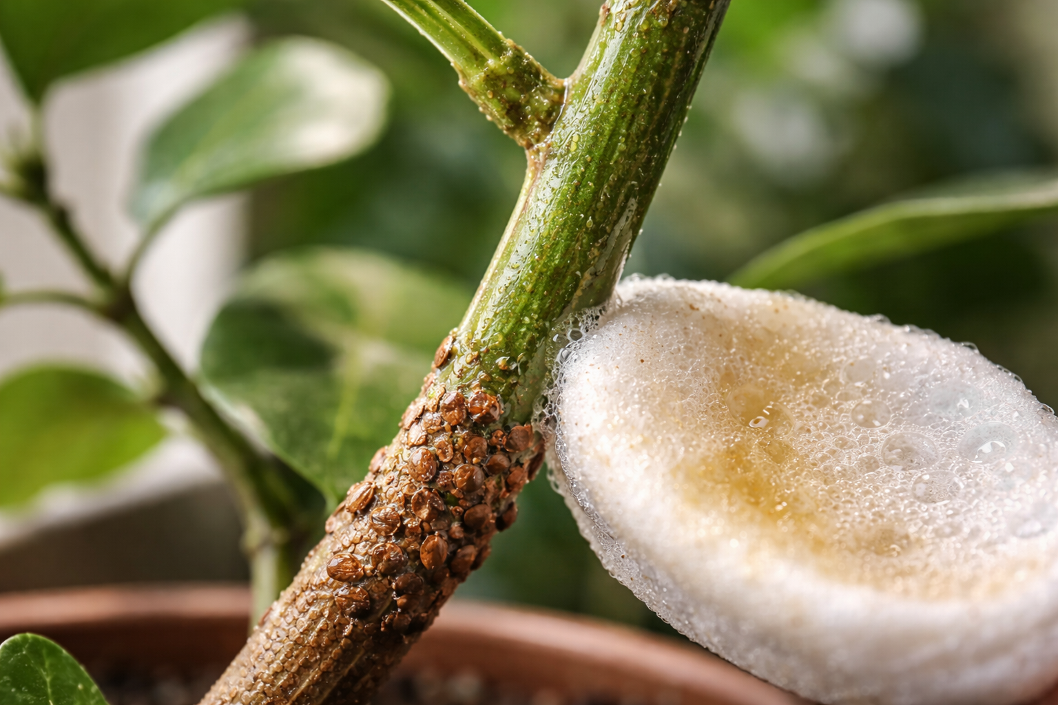Processen begynder med, at du forsigtigt fjerner skaller insekter med en børste dyppet i en svag alkoholopløsning eller sæbevand. Vær særlig opmærksom på bladaksene og undersiden af bladpladen langs årerne.