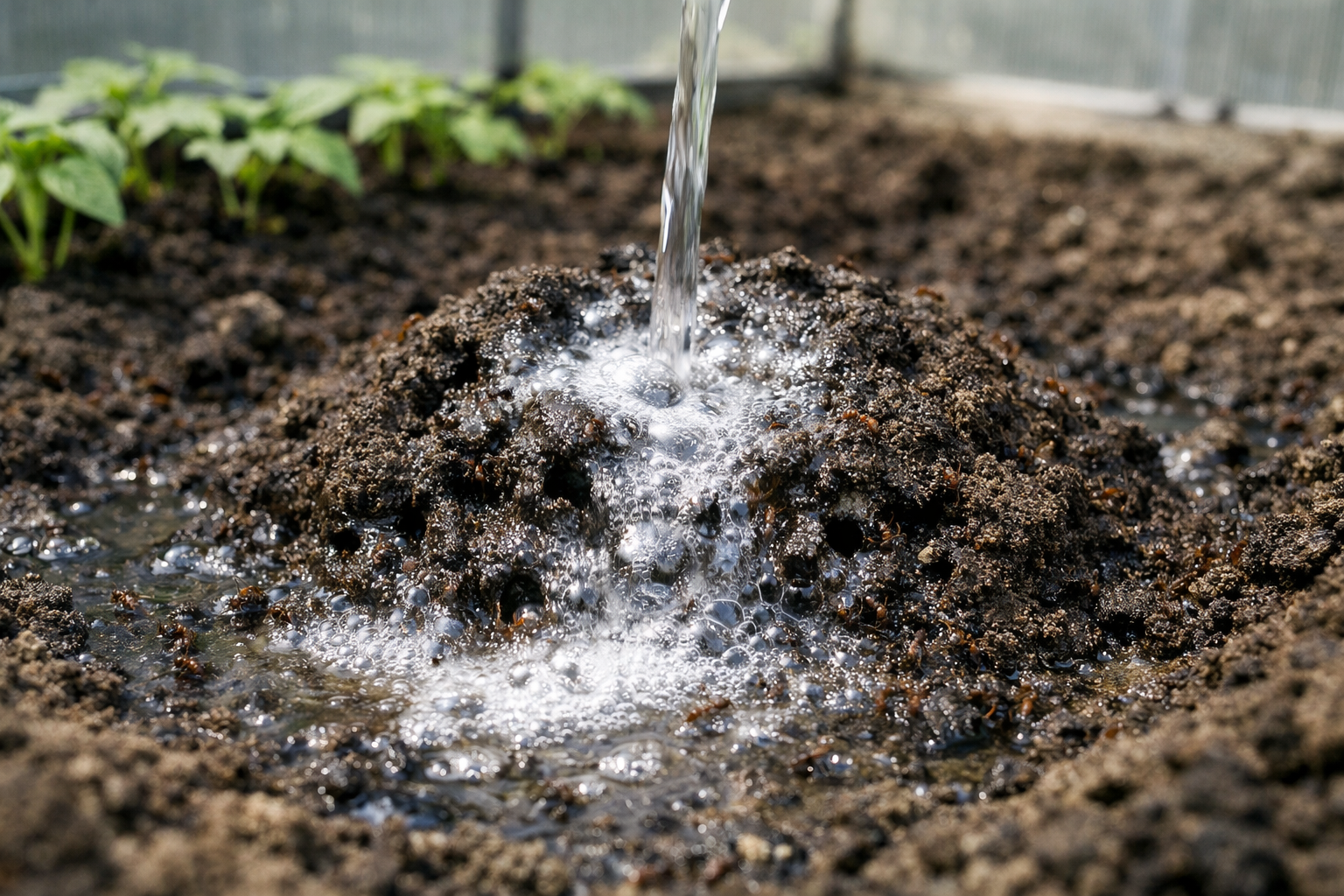 “Hæld aldrig stærkt kogende vand over en myretue direkte under tomatbuske, da det øjeblikkeligt vil koge planternes rødder og dræbe kimplanterne.”