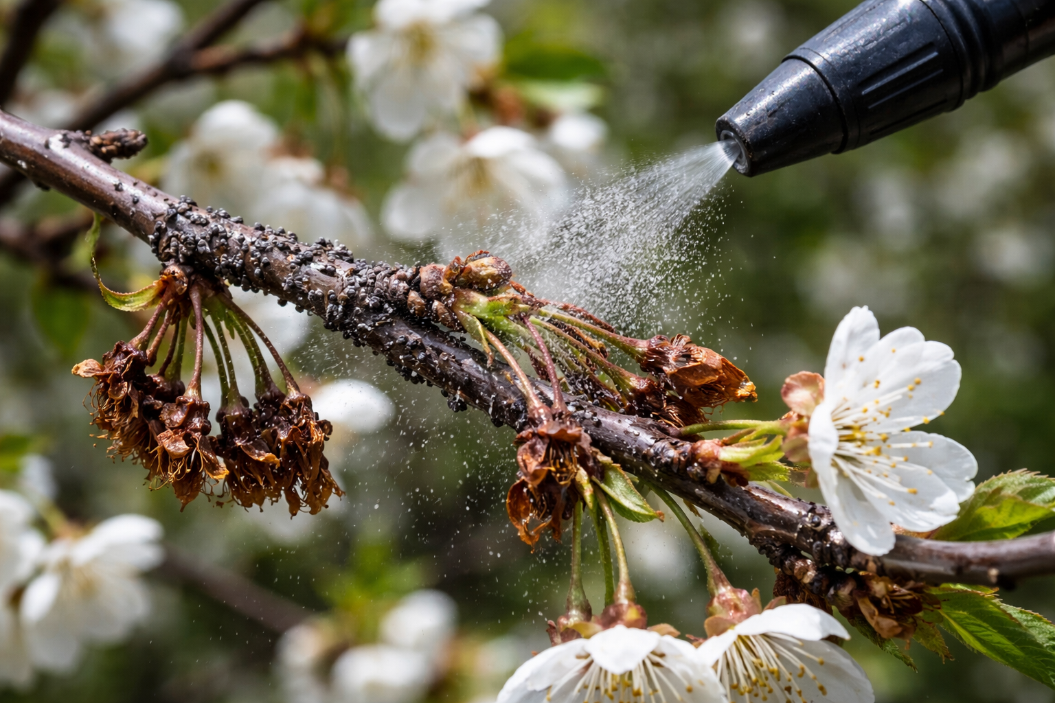 Den hemmelige nuance ligger i, at den primære infektion sker direkte gennem pistilen på den åbnede blomst, så træer skal sprøjtes strengt i en bestemt fase – ved rosenknoppen og umiddelbart efter, at kronbladene falder.