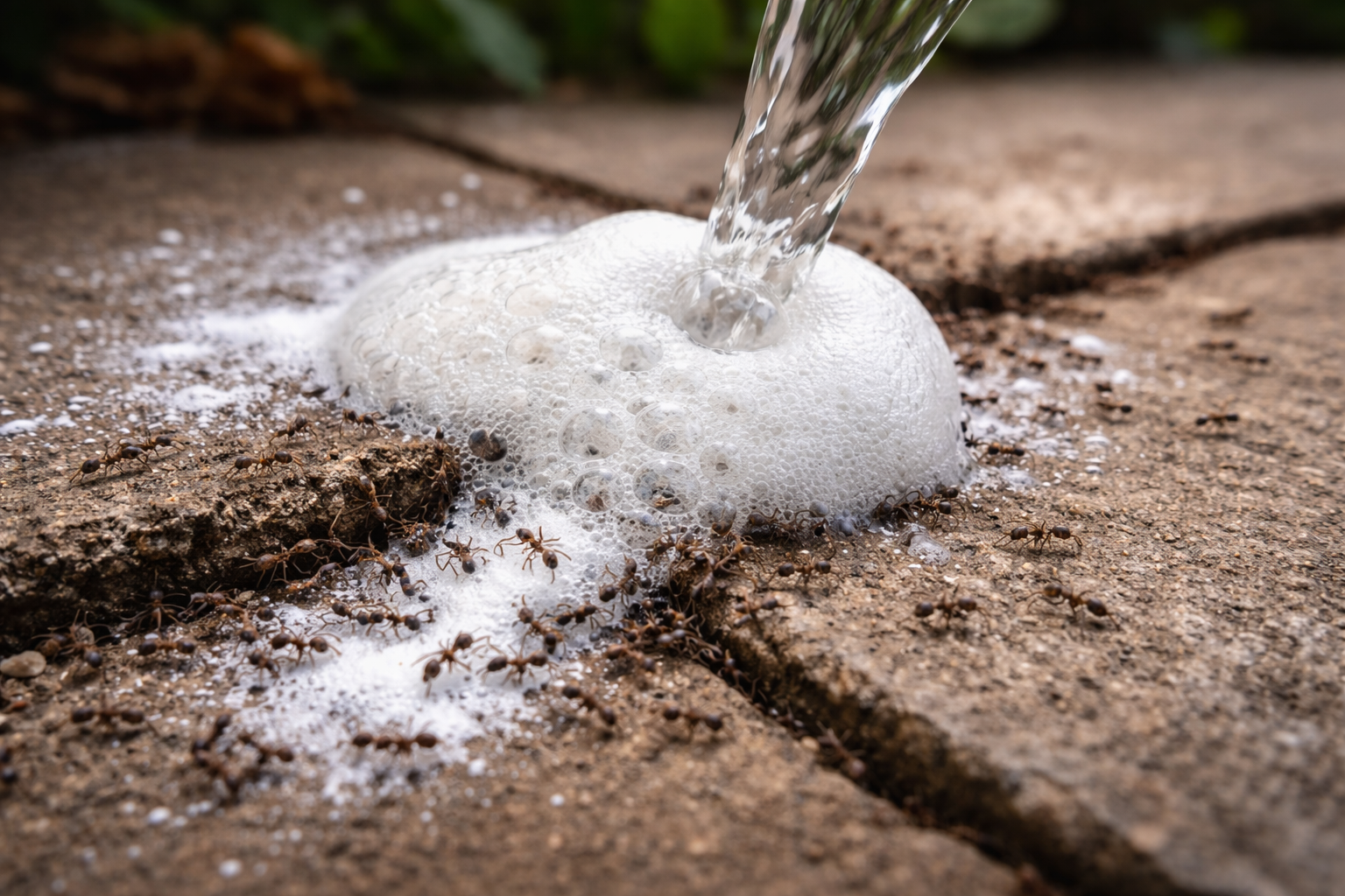 En stor fejl er bare at blande ingredienserne i en spand og tørre gulvet. Hemmeligheden er at bruge dem sekventielt lige på myresporene og skabe en gasudløsningsreaktion lige der, hvor skadedyrene samles.