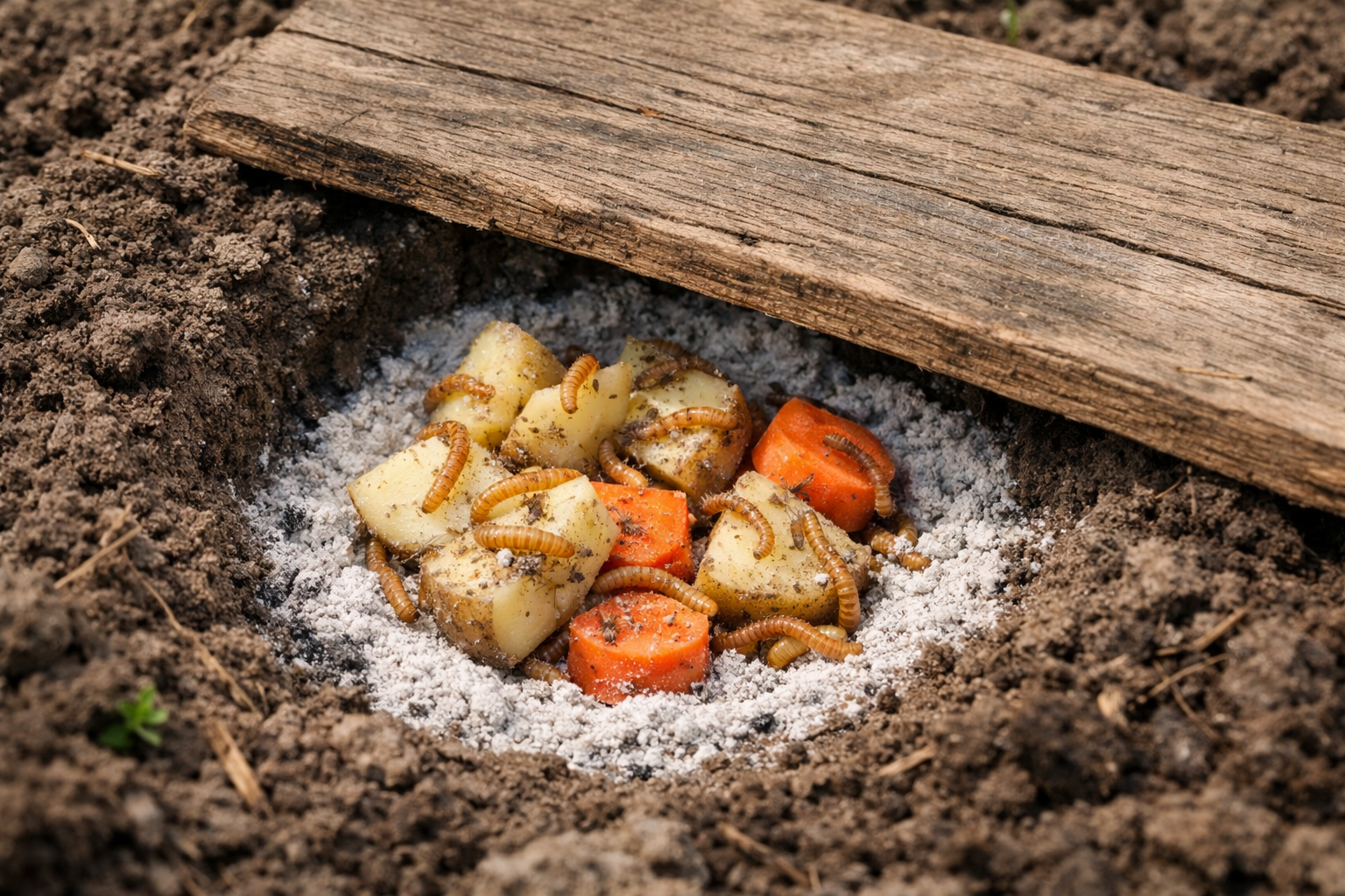“En hemmelig nuance: For at få lokkemaden til at virke hundrede procent skal du sætte grøntsagerne på træspyd – så bliver de lettere at fjerne fra jorden sammen med snesevis af indlejrede larver.”