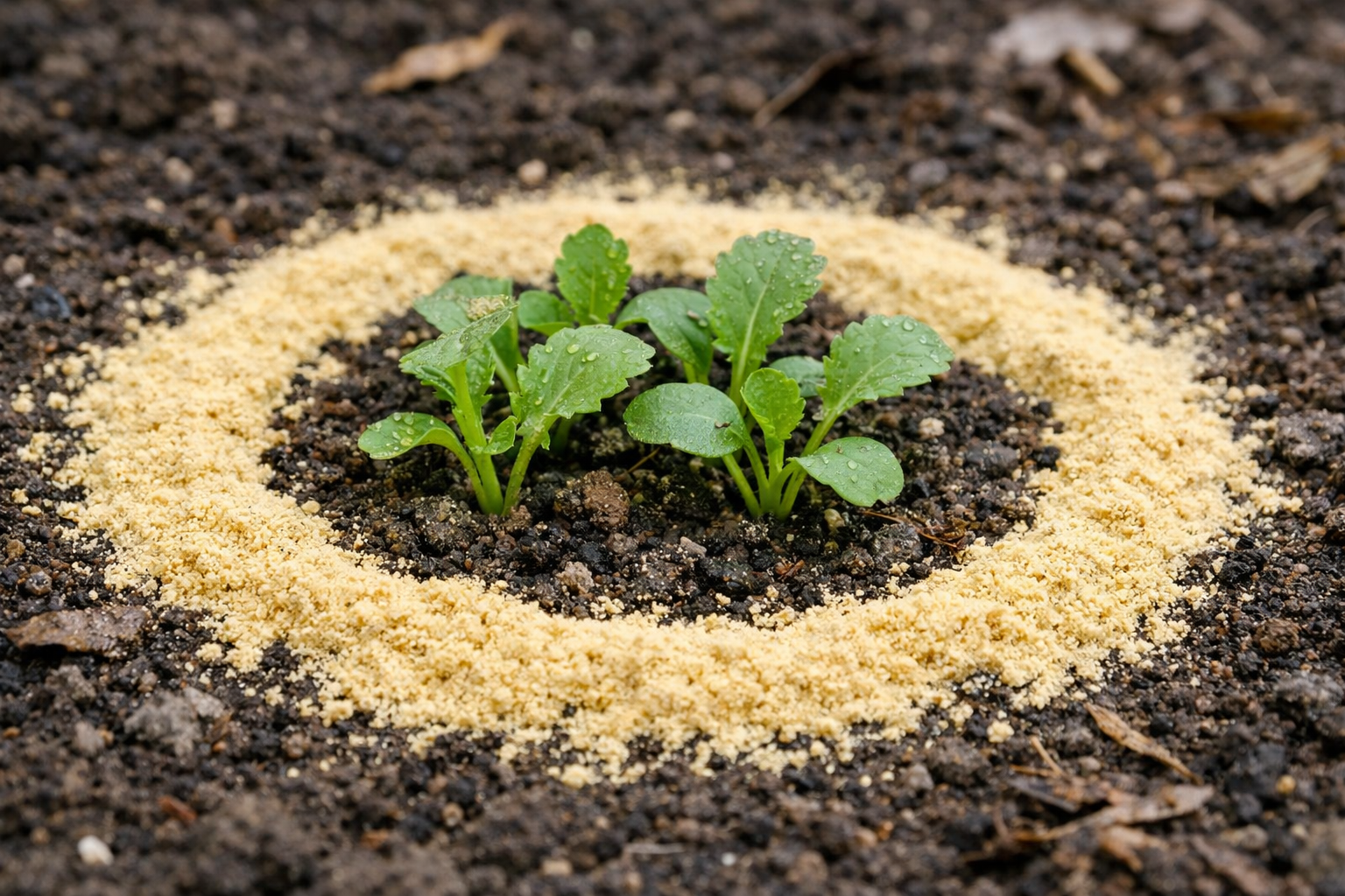 Spred tørt Sennepspulver i et jævnt lag på cirka fem centimeters bredde rundt om hvert bed.