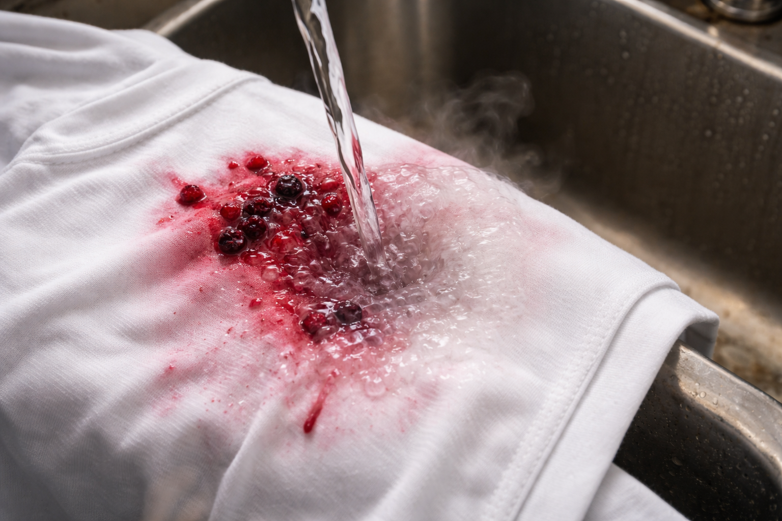 Det mest effektive værktøj til at tackle frisk snavs er altid lige ved hånden. Det er en almindelig kogende vand. Den høje temperatur nedbryder øjeblikkeligt de organiske farvestoffer, så de ikke har en chance for at sætte sig fast i fibrene.