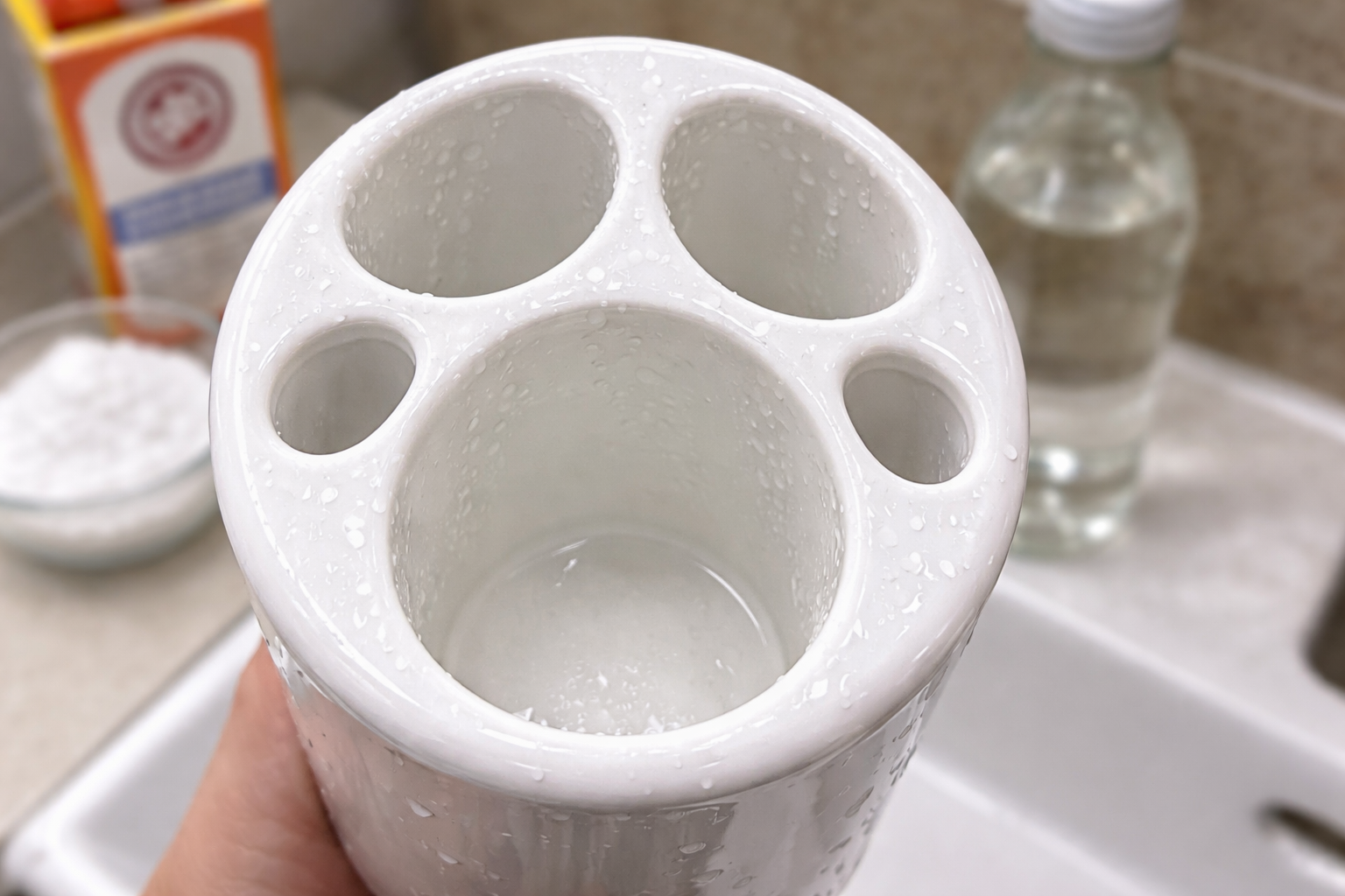 Ofte ignorerer vi dette tilbehør under rengøringen, selv om det er det, der kommer i kontakt med vores personlige hygiejneartikler. Der samler sig en tyk masse i bunden, som kan være problematisk at rengøre med almindeligt vand. Jeg prøvede mange muligheder og fandt den bedste balance mellem effektivitet og sikkerhed.