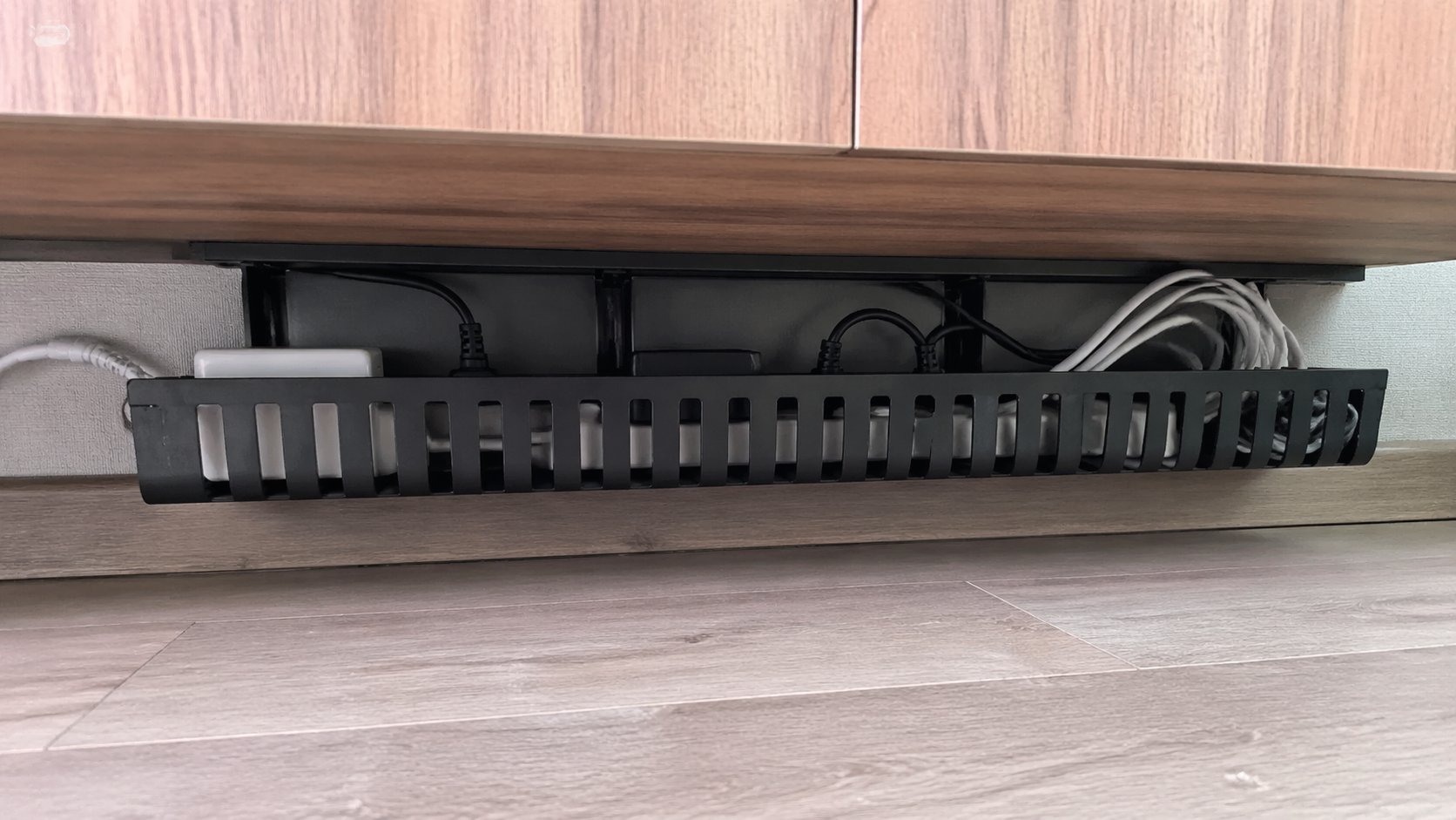 Fastgør en særlig metalkurv under bordpladen, hvor den massive strømforsyning og al overskydende længde bliver pænt gemt væk.
