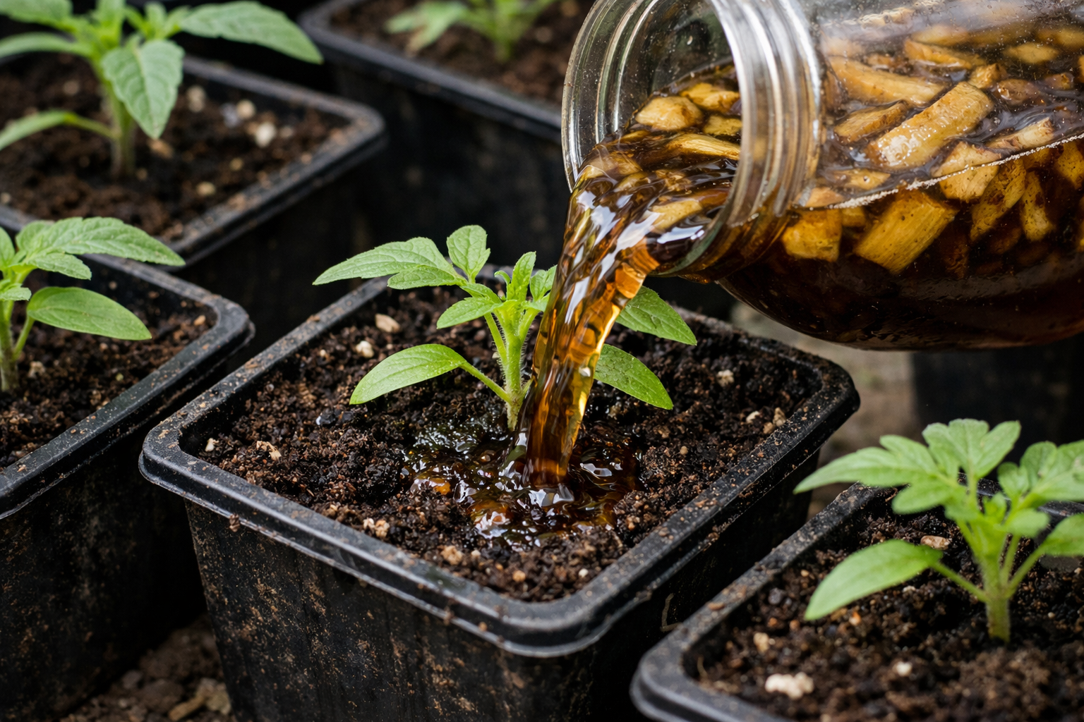 Regelmæssig brug af økologisk bananvand giver dig mulighed for at dyrke stærke frøplanter med tykke stængler uden for store omkostninger. Denne metode giver planterne en stabil og harmonisk ernæring uden risiko for at overmætte jorden med tunge kemiske elementer.