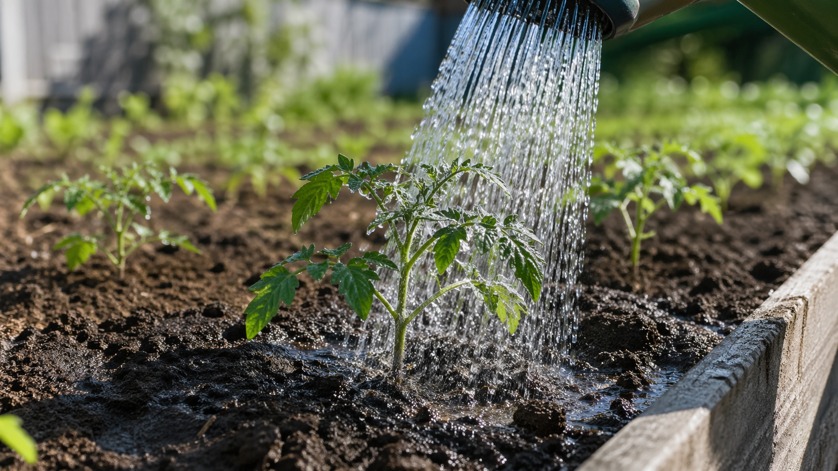 Vanding skal ske helt nede ved roden, så man undgår kontakt med bladene i stærkt sollys.