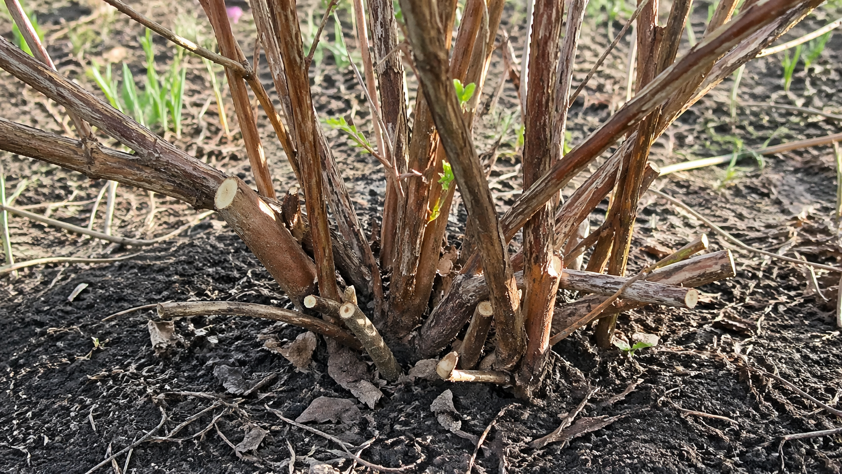 Gamle stammer skal skæres tilbage næsten til jorden, og sørg for at efterlade en lille stub for at stimulere væksten af nye skud.