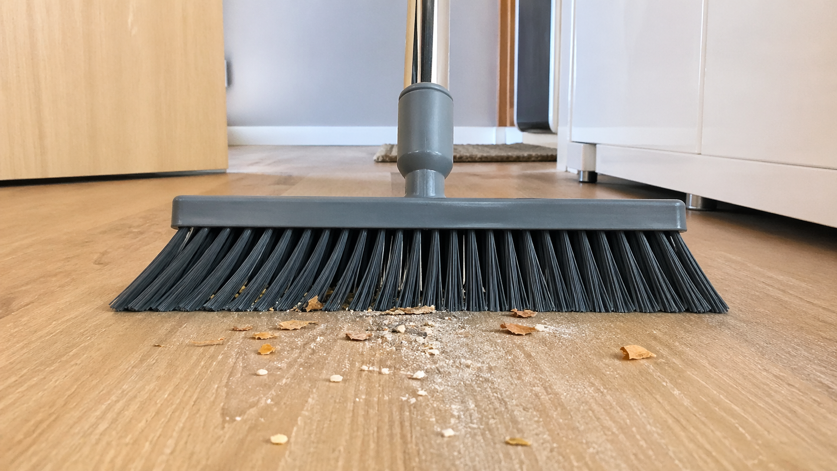 Ergonomi i rummet dikterer sine egne regler. Man fjerner ikke bare affald, man forhindrer det i at sprede sig i hele lejligheden. Det gælder især i indgangspartiet, hvor der samler sig slibende partikler, som ridser gulvet.
